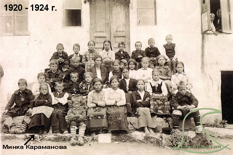 Тук искам да ви обърна внимание на една много стара снимка (Втората на страницата тук), която ми даде на времето моята баба Минка. Когато ми я показа за първи път ме попита: "Я сега да видим дали можеш да ме познаеш? За да ти помогна, ще ти кажа, че ти много приличаш на мен като малко момиченце." Това разбира се ми помогна много и веднага успях да позная баба ми, дори съм я отбелязала на снимката. А ако не се лъжа в дясно до моята баба Минка би трябвало да е седнал брат й Петър Караманов. Учителката на снимката е Мара Даскалова, която е прекарала живота си там в обучение на малките Атларчета.