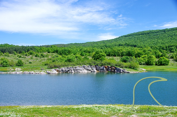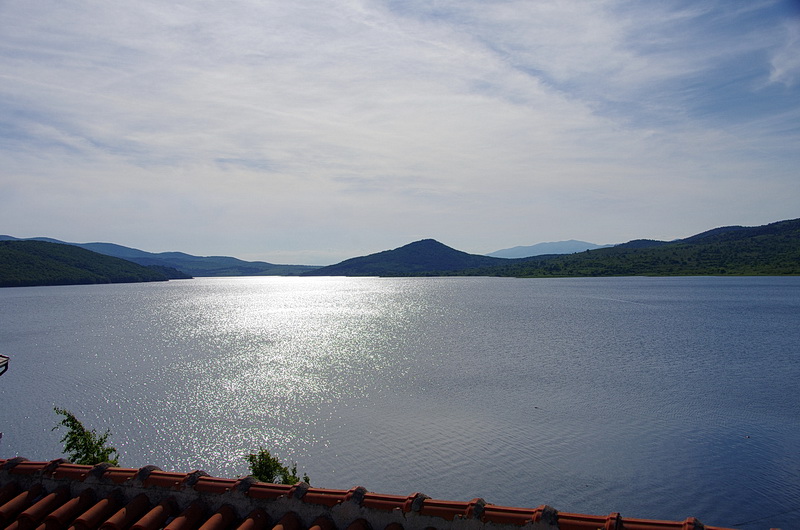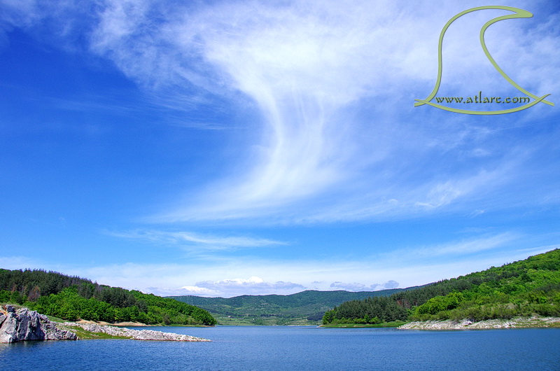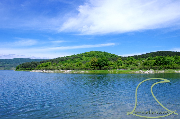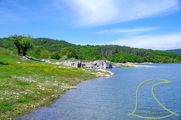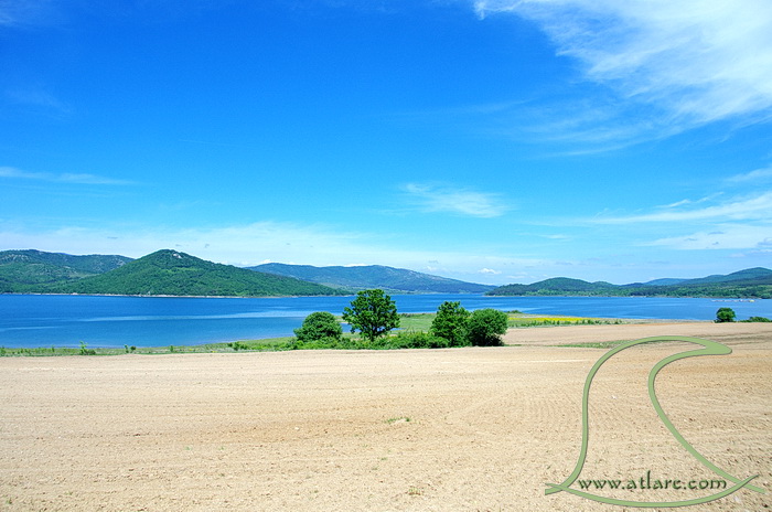 На Осмата снимка в средата виждате отново хълма на Острец. Някъде пред него и на дъното на язовира се е намирало нашето село Атлари - Жребчево. Снимката е направена от новия комплекс край язовира, от страната на стената.